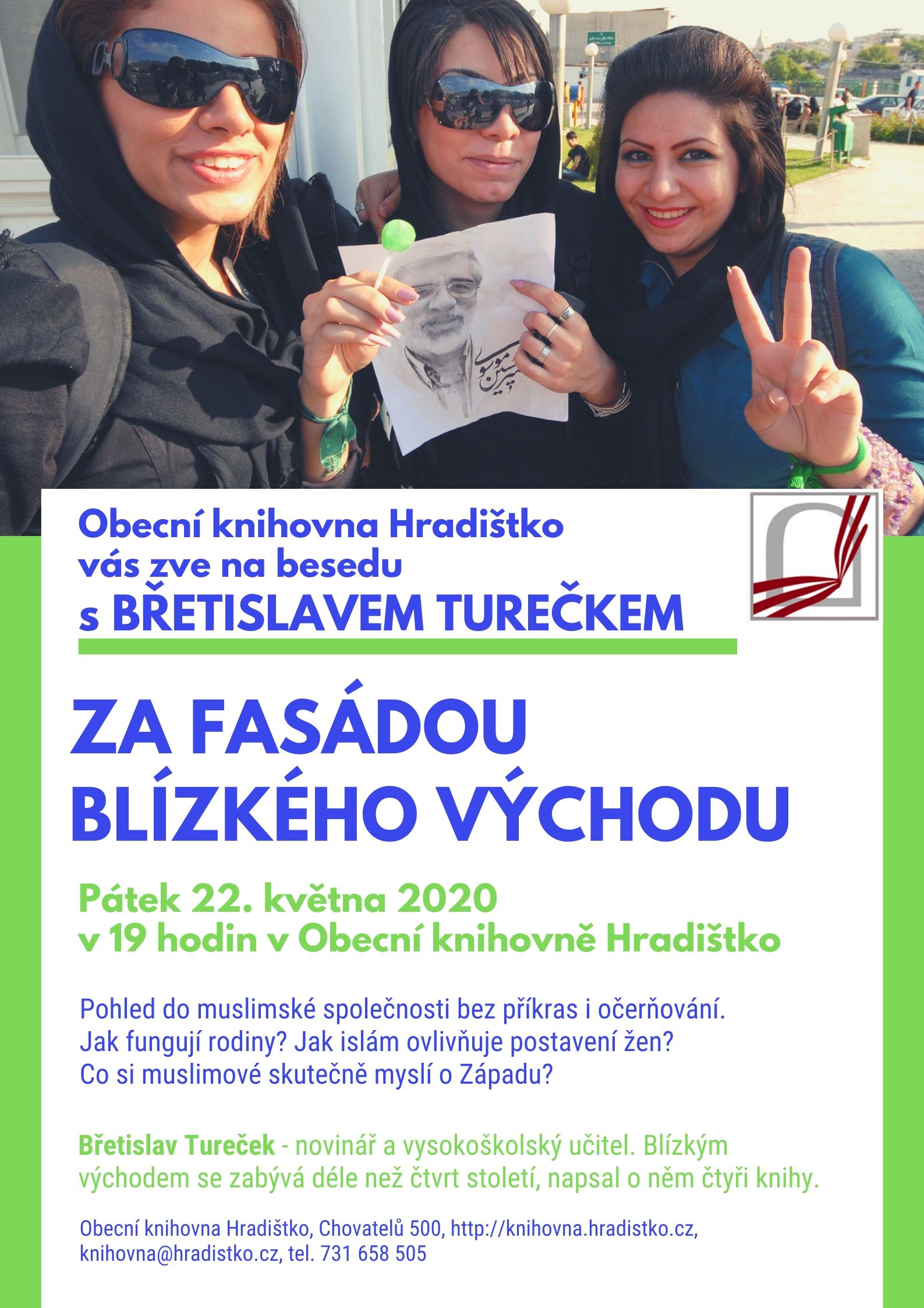 Nenechte si ujít besedu s Břetislavem Turečkem na téma Za fasádou Blízkého východu – pohled do muslimské společnosti bez příkras i očerňování. Jak fungují rodiny? Jak islám ovlivňuje postavení žen? Co si muslimové skutečně myslí o Západu?