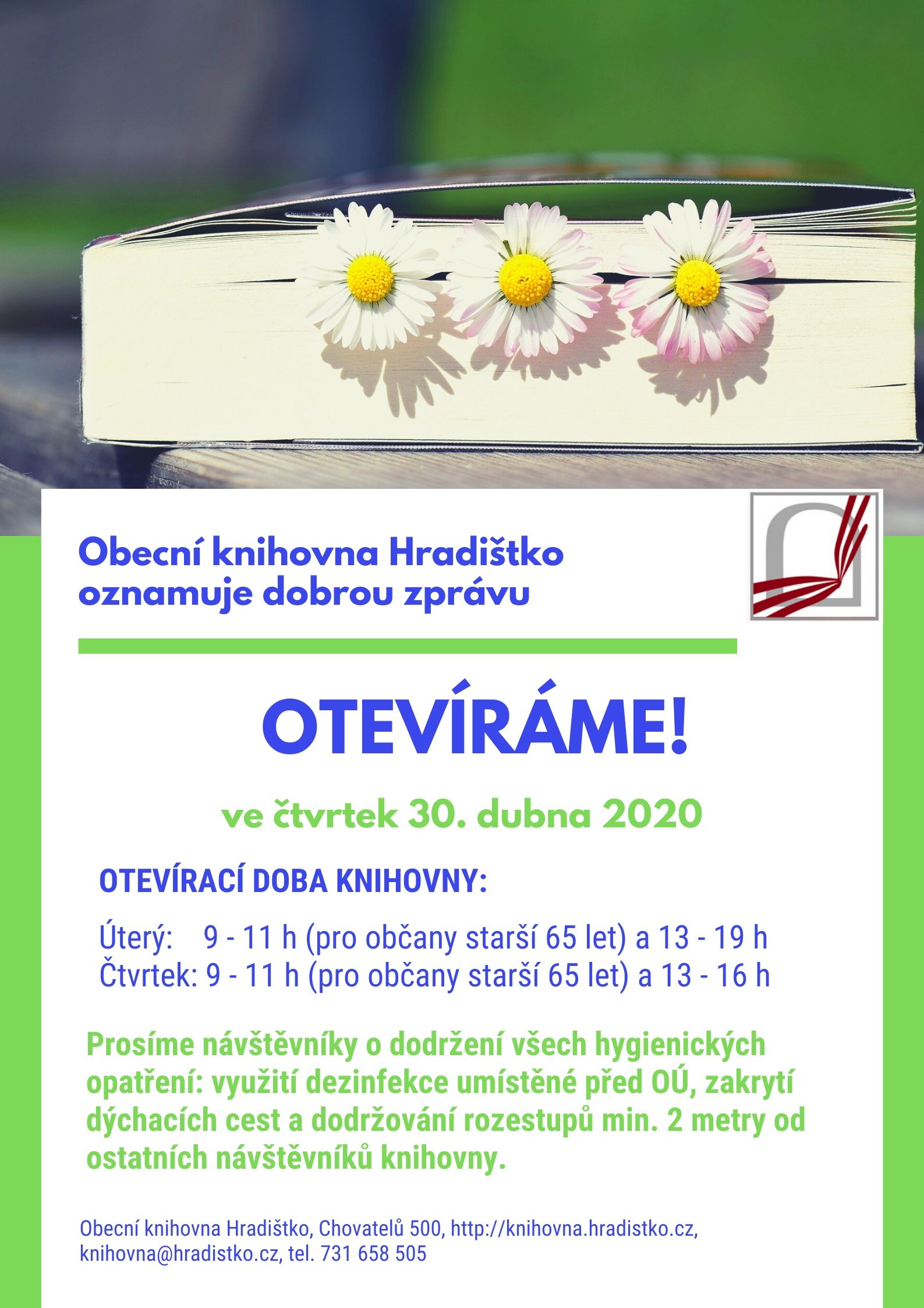 Dle nařízení vlády ČR mohou být od 27. dubna 2020 opět otevřeny knihovny. Knihovna Hradištko bude otevřena od čtvrtka 30. dubna. Obnoveny budou pouze výpůjční a informační služby. Návštěvníci musí dodržovat platná hygienická a bezpečnostní opatření (použití dezinfekce umístěné před budovou obecního úřadu, zakrytí dýchacích cest a dodržování rozestupů min. 2 metry od ostatních návštěvníků). Otevírací doba knihovny je rozšířena o dopolední čas vyhrazený pro návštěvníky starší 65 let, a to v úterý a čtvrtek od 9 do 11 hodin.
