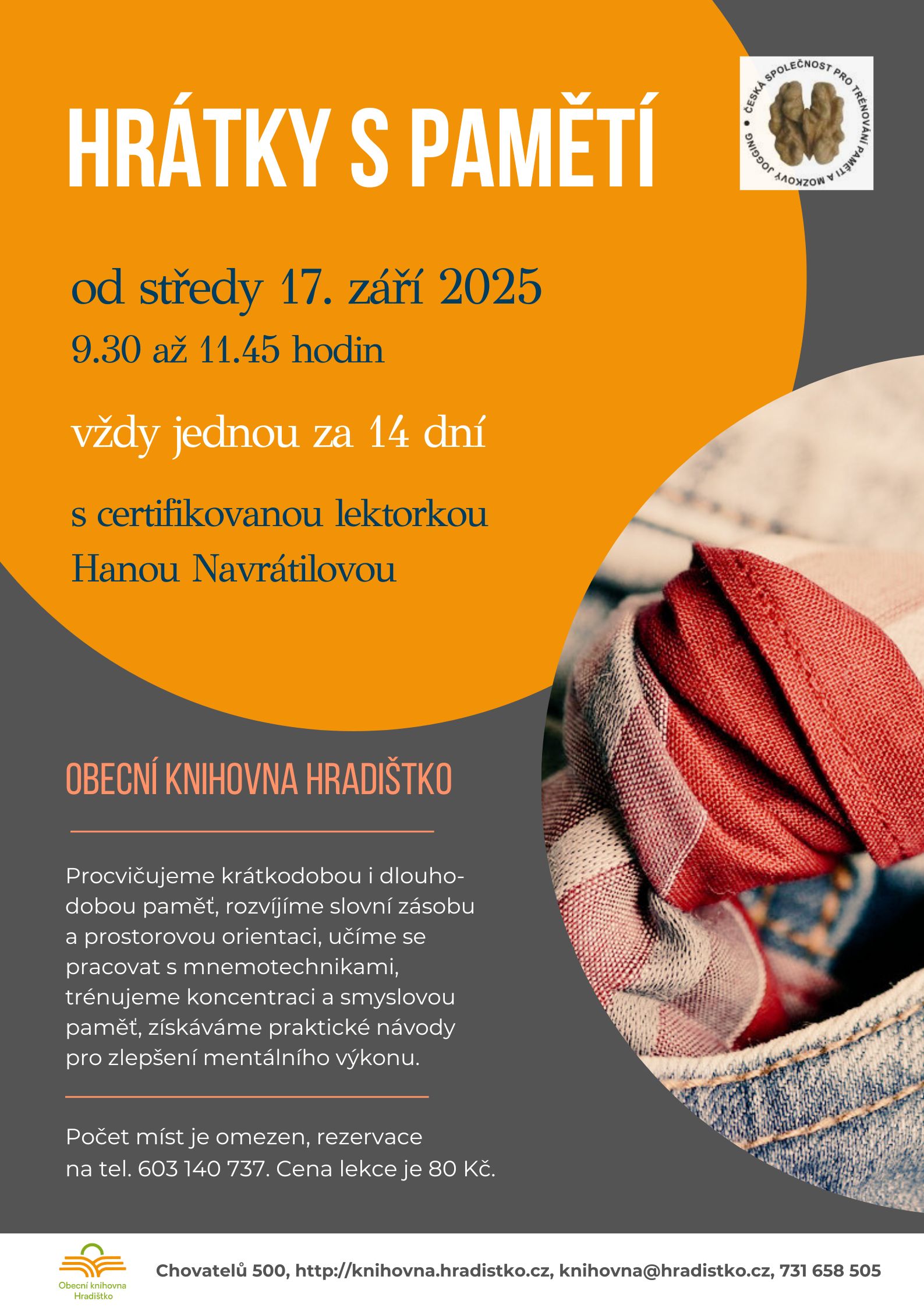 Od 17. září 2025 začíná kurz trénování paměti, který se koná jednou za 14 dní vždy ve středu od 9.30 do 11.45 hodin. Přijďte si vyzkoušet, jak chutná trénování paměti zábavnou formou v přátelském prostředí. Naučíte se, jak lze procvičovat krátkodobou i dlouhodobou paměť, koncentraci, slovní zásobu, číselné údaje a mnemotechniky v praxi. Kurz vede certifikovaná lektorka Hana Navrátilová. Počet míst je omezen, rezervace na tel. 603 140 737. Cena lekce je 80 Kč. Plakát zde.