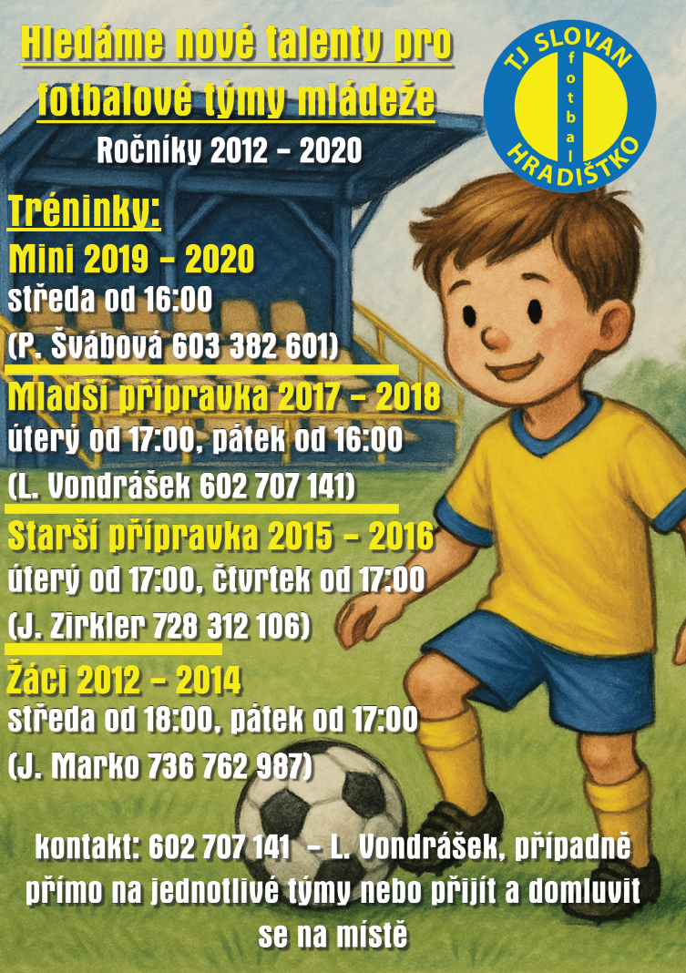 Zveme děti na kroužek atletiky pod vedením fyzioterapeutky Markéty Matisové, který se koná každé pondělí a úterý od 15.30 do 16.30 hodin na fotbalovém hřišti TJ Slovan Hradištko. Kroužek je zaměřen na rozvoj všestranné pohybové zdatnosti a kondice. Zájemci mohou přijít na nábor, který se koná 15. a 16. září 2025, nebo kontaktovat lektorku na tel. 777 630 723. Plakát zde.