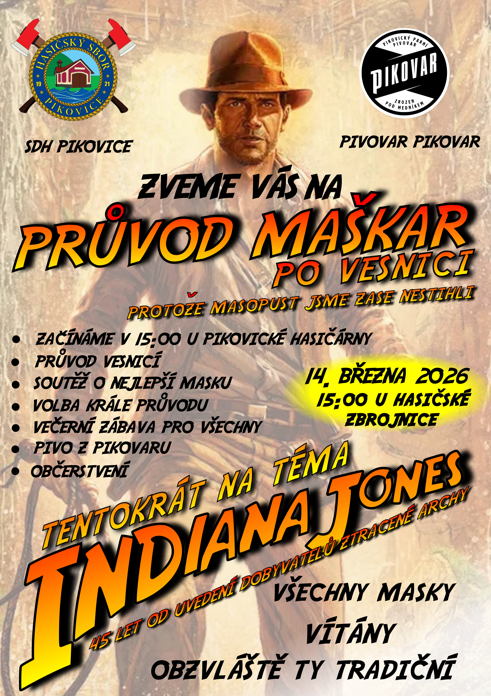 Zveme vás na průvod maškar, který se koná v sobotu 14. března 2026 v 15 hodin u hasičské zbrojnice SDH Pikovice. Plakát zde.