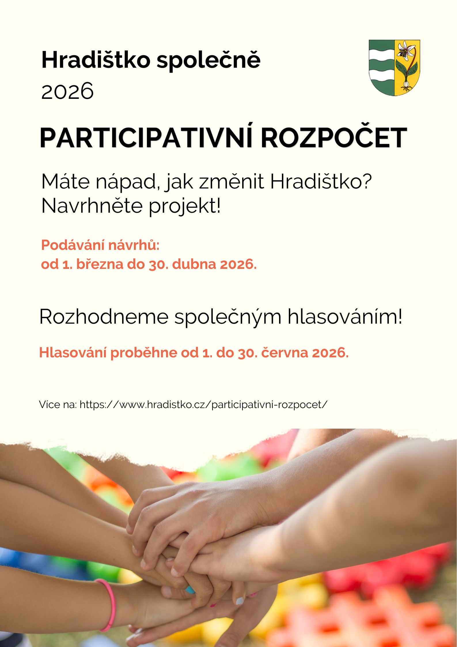 Zahajujeme 4. ročník participativního rozpočtu „Hradištko společně“. Chcete se aktivně zapojit do rozvoje obce a máte nápad, jak změnit Hradištko? Navrhněte projekt a podejte ho od 1. března do 30. dubna 2026 přes online formulář. O tom, který z nich se zrealizuje, rozhodneme společným hlasováním v červnu 2026. Všechny zásady, harmonogram a informace o možnosti přihlášení projektů, posouzení realizovatelnosti a posléze hlasování najdete na samostatných webových stránkách participativního rozpočtu „Hradištko společně“. Plakát zde.