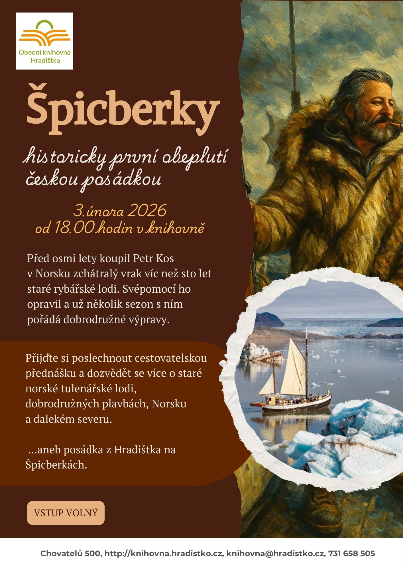 Srdečně vás zveme na přednášku Petra Kose o historicky prvním obeplutí Špicberků českou posádkou, která se uskuteční v úterý 3. února 2026 v 18 hodin v knihovně. Přijďte se dozvědět více o staré tuleňářské lodi, dobrodružných plavbách, Norsku a dalekém severu. Vstup volný. Plakát zde.