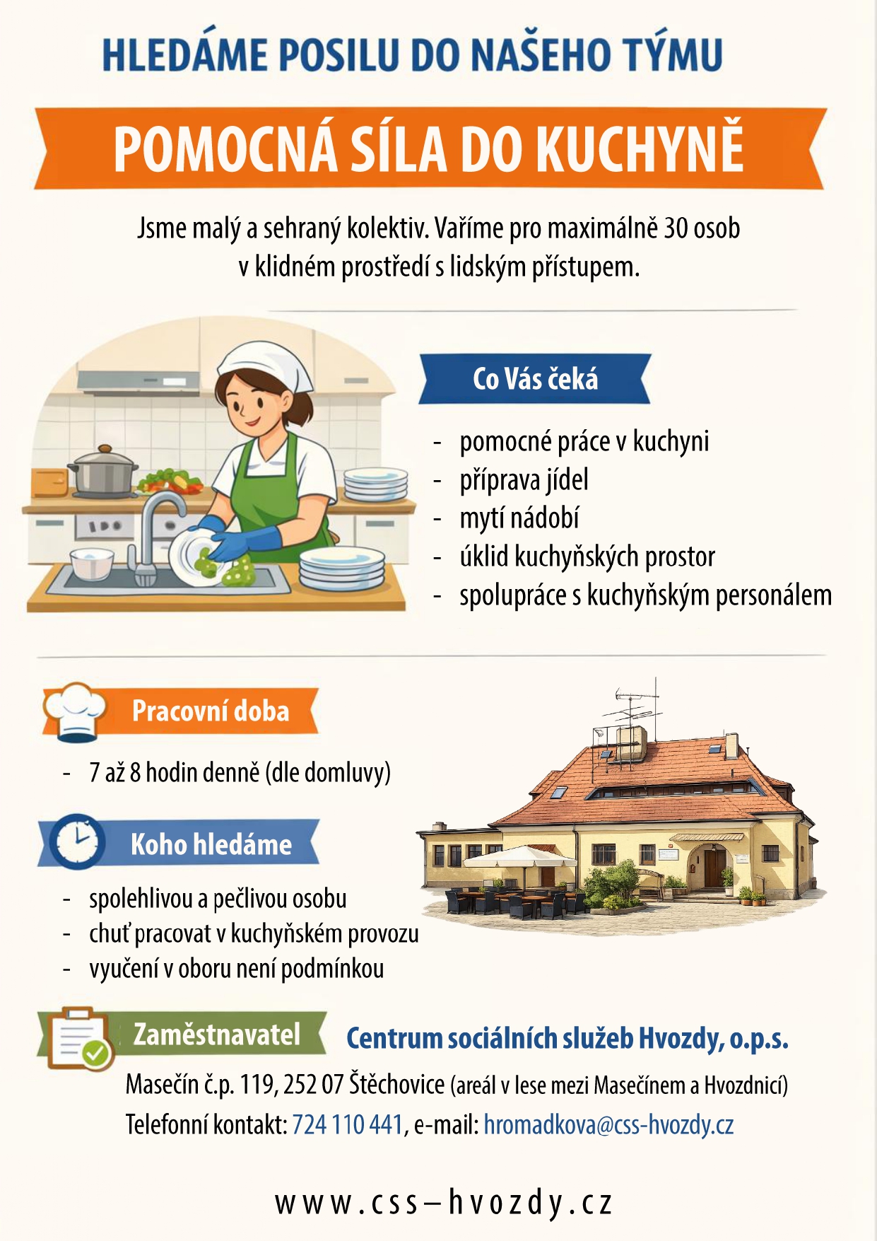 Centrum sociálních služeb Hvozdy, o.p.s. hledá novou pomocnou sílu do kuchyně. Více info zde.