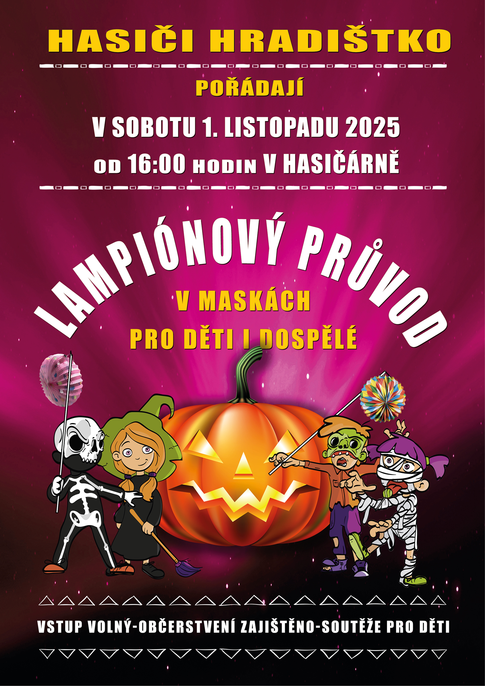 SDH Hradištko vás srdečně zve na lampionový průvod v maskách pro děti i dospělé, který se koná v sobotu 1. listopadu 2025 od 16 hodin v areálu hasičské zbrojnice. Můžete se těšit na soutěže pro děti, vstup je volný, občerstvení zajištěno. Plakát zde.