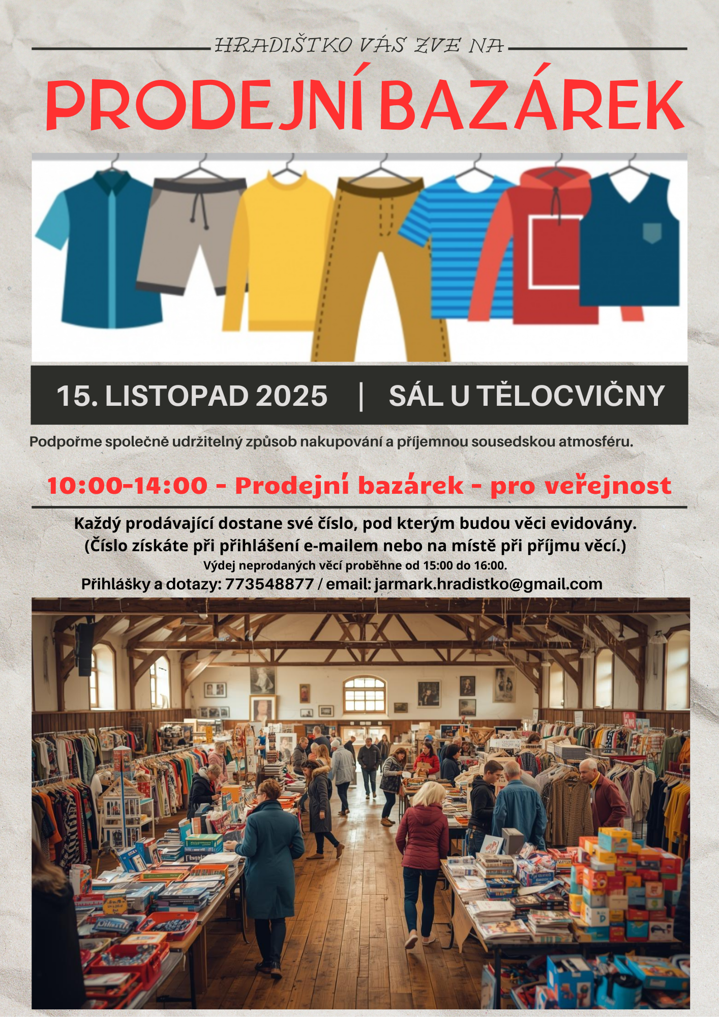 Zveme vás na prodejní bazárek, který se koná v sobotu 15. listopadu 2025 ve společenském sále vedle tělocvičny. Přijďte nakoupit i prodat oblečení, hračky, knížky, domácí potřeby a další věci, které ještě mohou udělat radost jiným. Podpořme společně udržitelný způsob nakupování a sousedskou atmosféru.